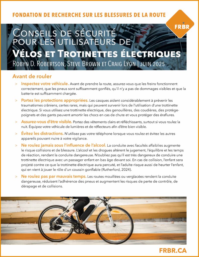 Les appareils de micromobilité ont considérablement transformé la mobilité urbaine au cours de la dernière décennie en offrant des alternatives pratiques, écologiques et abordables aux véhicules motorisés traditionnels. Mais ils ont également créé de nouveaux défis en matière d'urbanisme et de sécurité routière. L'Association canadienne des automobilistes a chargé la Fondation de recherche sur les blessures de la route d'examiner les recherches canadiennes et internationales sur les risques liés à la sécurité routière associés aux vélos et aux trottinettes électriques. Ses conclusions sont résumées dans une fiche d'information intitulée « Conseils de sécurité pour les utilisateurs de vélos et trotinettes électriques ».
